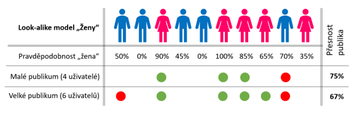 Na ilustraci níže je výše uvedené pravidlo demonstrováno na příkladu look-alike modelu pro ženy. Každému uživateli, u kterého pohlaví neznáte, ale máte k němu dostatek dat o jeho internetovém chování, model spočítá míru pravděpodobnosti, že daný uživatel je „žena”. Vychází tak z podobnosti internetového chování těchto uživatelů a části uživatelů, u kterých tuto informaci znáte. U některých uživatelů to model odhadne velmi přesně, u některých se může plést. Výsledné publikum pak tvoříte tak, že si uživatele seřadíte podle této pravděpodobnosti a určíte si požadovanou přesnost. Zde do hry vstupuje již zmíněná velikost publika v populaci, cena daného cílení a také velikost kampaně, pro kterou publikum tvoříte. Nicméně je zcela zřejmé, že čím více publikum rozšiřujete, tím jeho přesnost klesá.