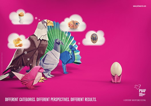 Klíčový vizuál znázorňuje růžového origami ptáčka, symbol PIAFu, spolu s papírovým dravcem, holubem a pávem, reprezentující marketéra (klienta), strategického plánovače a kreativce a jejich různé pohledy na kampaně. Skupina origami ptáků společně představuje porotu PIAFu, v níž zasedají vedle kreativců také zástupci dalších reklamních profesí. Nový vizuální styl je již součástí aktualizovaného webu festivalu a v nadcházejících týdnech se objeví také v reklamní kampani v tisku a na internetu.