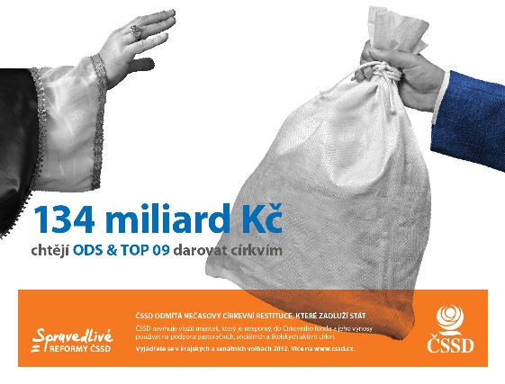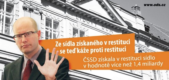 V souvislosti s tím je nepřehlédnutelná billboardová přestřelka o církevní restituce. Na první z výše uvedených billboardů totiž reagovala ODS billboardovou odpovědí, v níž ODS upozornila na skutečnost, že ČSSD byť své sídlo získala v restituci, sama proti restitucím káže. Proti tomu se sociální demokraté okamžitě ohradili.