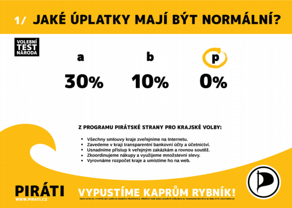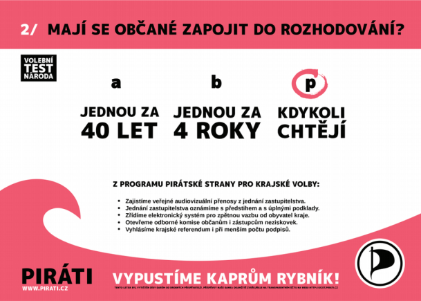 Česká pirátská strana pro krajské volby připravila kampaň „Volební test národa“, kterou podporuje v krajích svými plakáty.