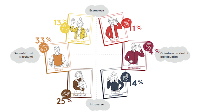 Zmíněné oblasti jsou v různých segmentech populace pojímány jinak. Každý z nich má jiné priority, obavy i přístup k udržitelnosti, zdraví či technologiím. Kantar ve své studii českou populaci dělí na šest základních skupin, mezi něž patří družní (33 %), starostliví (25 %), zodpovědní (14 %), bezstarostní (13 %), troufalí (11 %) a sebevědomí (4 %).