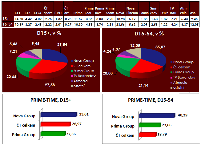 V podílech na sledovanosti se skupina Prima dostala v hlavním vysílacím čase u diváků 15-54 na pozici druhé nejsledovanější. Nadprůměrně si v sobotu vedla TV Barrandov, jejíž podíl překročil 7 % (D15+).