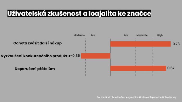 Právě uživatelská zkušenost je klíčem k zákaznické loajalitě. Pokud je zákazník s daným produktem spokojený, je podle průzkumu Forrester pravděpodobnější, že je doporučí svém přátelům a zároveň se vyhne nákupu podobného produktu od konkurenční značky.