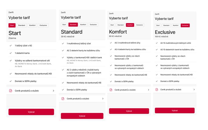 Klienti KB mají mít v novém pojetí stejný zážitek, ať navštěvují pobočku nebo vyřizují své požadavky přes aplikaci. Nově vybudované služby mají být rychle dostupné a k produktům je možné dostat se díky několika kliknutím v digitálních kanálech. Prodej, služby a podporu může klient sjednat, využívat, měnit a rušit plně online. Pokud klient potřebuje podporu, omnikanálový přístup mu umožní diskutovat s bankéřem na dálku, kontaktovat centrum podpory nebo přímo navštívit pobočku. Klienti budou mít nově na výběr ze 4 tarifů, a to Start, Standard, Komfort a Exclusive.