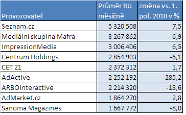 Pololetní srovnání jednotlivých provozovatelů ukazuje na mírnou změnu pozic oproti stejnému loňskému období. Lídr Seznam.cz potvrdil svoji vedoucí pozici, když jeho vývoj návštěvnosti kopíroval celkovou průměrnou návštěvnost na internetu. Pozici dvojky oproti loňsku upevnila mediální skupina Mafra.