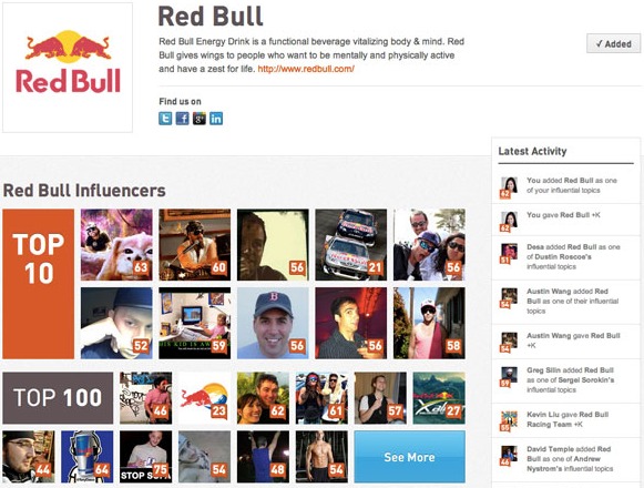 První značkou, jejíž uživatelé podléhají měření Kloutu, se stal Red Bull. V následujících týdnech, po ukončení beta testování, se počet monitorovaných značek rozšíří. Seznam influencerů, stejně jako stream aktivit je aktualizován v reálném čase.