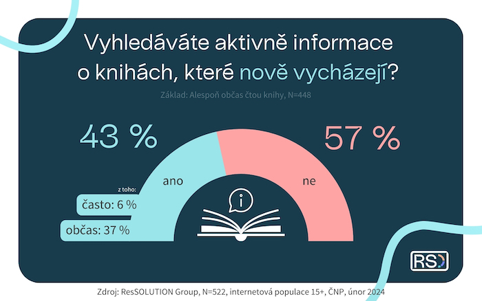 Informace o knihách, které nově vycházejí, aktivně vyhledávají více než dvě pětiny alespoň občasných čtenářů, přičemž 6 % to dělá často a 37 % občas. Více se o dění na trhu s knižními novinkami zajímají opět ženy a respondenti s vyšším dosaženým vzděláním.