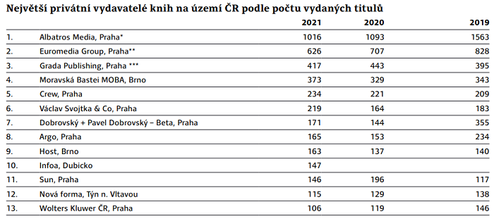 Struktura růstu se oproti předchozím letům proměnila. Zatímco středně velké subjekty hlásí oproti roku 2020 spíše lehký nárůst počtu vydaných titulů, u produkce tří vůdčích vydavatelských skupin došlo k mírnému poklesu. Jedná se o Albatros Media, která ke svým patnácti značkám přidala nově Mladou frontu, firmu Euromedia Group se svými jedenácti značkami a firmu Grada Publishing s pěti nakladatelskými značkami.