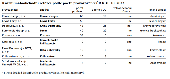 Největší knihkupeckou sítí v Česku je společnost Kanzelsberger, která provozuje 63 prodejen. Následují Levné knihy s 58 prodejnami a Knihy Dobrovský s 43 prodejnami.