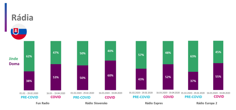 U slovenských rádií výzkumníci mimo jiné zaznamenali zmenšující se podíl poslechovosti mimo domov ve prospěch poslechu ve slovenských domácnostech a ačkoli první týdny pandemie zaznamenala rádia mírný pokles poslechovosti, podobně jako u televizí je z posledních dubnových dat patrný trend návratu k hodnotám poslechovosti před pandemií.