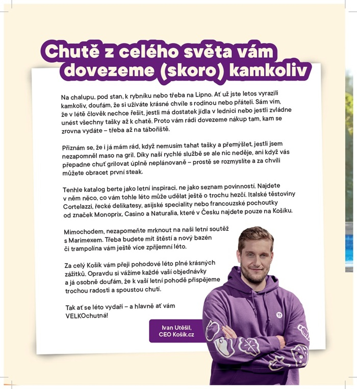 „Během 10 minut si tak může každý prolistovat celý výtisk a zároveň vytvořit základ příštího nákupu, který si nechá připravený v nákupním košíku. Na nákupech na Košíku se často podílí celá rodina, když si jednotliví členové přidávají, co zrovna potřebují. I proto jsme u našeho nového periodika zvolili tuto jednoduchou formu – čas si na něj najde každý člen domácnosti,“ vysvětluje Tereza Kumperová, brand manažerka online supermarketu Košík.cz