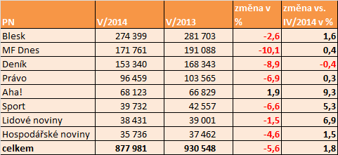 Nejprodávanějším tuzemským deníkem zůstává bulvární Blesk, který společně s dalším bulvárním deníkem Aha! a s Lidovými novinami zaznamenal v květnu nejlepší výsledky z tuzemských deníků, pokud jde o meziroční vývoj. Aha! pak jako vůbec jediný deník si v meziroční srovnání dokonce polepšil, a to 2 procenta. Naopak nejvyšší snížení prodaného nákladu se v meziročním srovnání dotkl deníku MF Dnes.