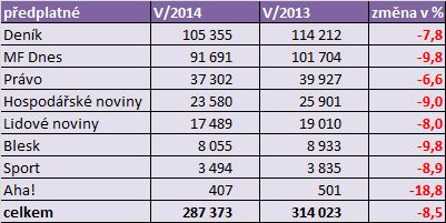 Vývojové srovnání v pultovém prodeji a v předplatném je meziročně o něco méně příznivé – ukazuje na snížení oproti loňskému květnu o 8 % až 9 %.