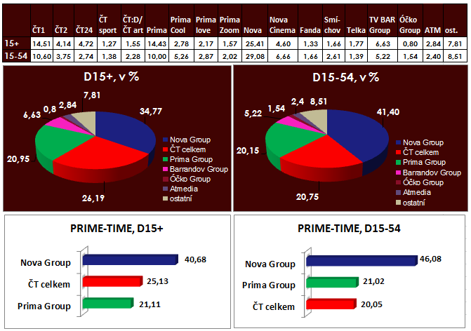 Pondělní večerní souboj skončil v širší cílové skupině vyrovnaně. O dvacet tisíc diváků víc nakonec přilákala filmová komedie Dědictví aneb Kurva se neříká (Nova), než kolik diváků sledovalo seriál Labyrint (ČT1). Seriál Přístav (Prima) byl trojkou večera s necelými 600 tis. diváků. V mladší cílové skupině 15-54 byl náskok filmové komedie výraznější než ve skupině 15+.