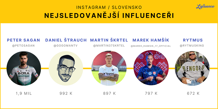 Lafluence také publikovala aktuální grafy ze světa českých a slovenských influencerů na Instagramu. Nejpopulárnějším českým instagramerům vévodí fotbalista Petr Čech (2,1 mil sledujících) a kreslířka Silvie Mahdalová (1,3 mil), zatímco mezi nejsledovanější slovenské instagramery patří cyklista Peter Sagan (1,9 mil) a z žen modelka Lucia Javorčeková (2,1 mil).
