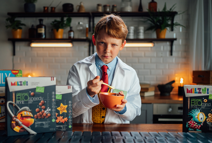 „Chtěli jsme co nejvíc vystihnout, že si na výběru produktů dávají v Lepším složení opravdu záležet. Volí produkty bez éček, barviv a dalších škodlivých látek. A přitom jde pořád o potraviny, které dětem chutnají,” komentuje vznik kreativy její spoluautorka Pavlína Štochlová a dodává: „V samotném zpracování jsme se snažili vytvořit hravou laboratoř. Jídlo přijíždí malému vědci po pásovém dopravníku, mléko do misky napouští plnící linka, příbor podává robotická ruka.“