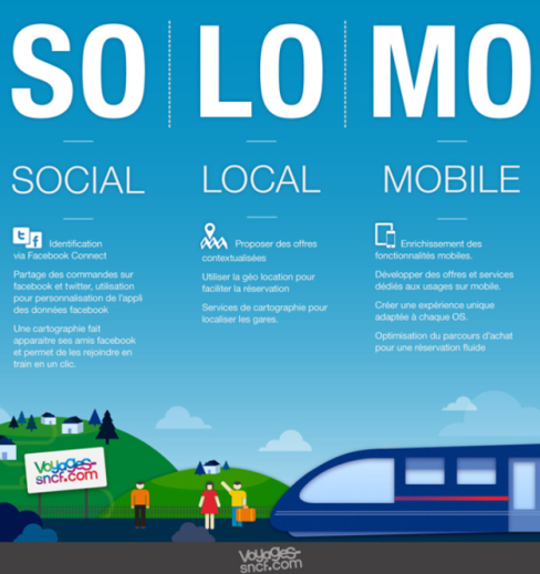 Za příklad, jak je možné aplikovat SoLoMo do marketingové komunikace, mohou sloužit například francouzské železnice SNCF, které jsou sociální, lokální a mobilní v jednom. Přes FB se mohou jejich zákazníci zaregistrovat a rezervovat jednu i více jízdenek. Jejich údaje jsou uloženy, a rezervace je tak „hyperpersonalizována“. Navíc je možné stáhnout si i aplikaci, díky níž se mohou cestující najít se svými FB kamarády ve stejném vlaku. Když je zákazník lokalizován prostřednictvím mobilního zařízení, rezervační systém sám předvyplní rezervaci, na mapě ukáže nejbližší nádraží a spolu s tím nabídne i další služby. Jízdenka mu potom přijde na mobil v podobě QR kódu.