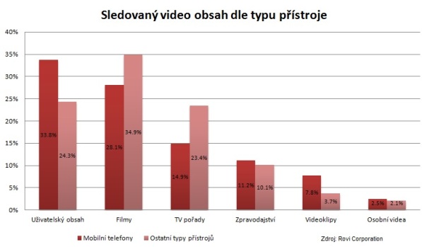 Zatímco nejsledovanější typy pořadů sledovaných na chytrých telefonech a jiných přístrojích se neliší – jde o uživateli natočené klipy, filmy a televizními show –, rozdílně již působí proporce jednotlivých typů obsahu. Na mobilech jasně dominuje uživateli vygenerovaný obsah, naopak větším obrazovkám dominuje filmová zábava. Výrazně populárnější na displejích s nižší úhlopříčkou jsou pak také hudební videa.