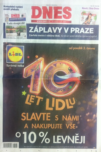 V tisku Lidl využil v pondělí 3. června i přebal titulní strany Mladé fronty Dnes. Jeho vizuál se tak ocitl pod titulkem o záplavách v Praze, o kterých je informováno až uvnitř čísla.