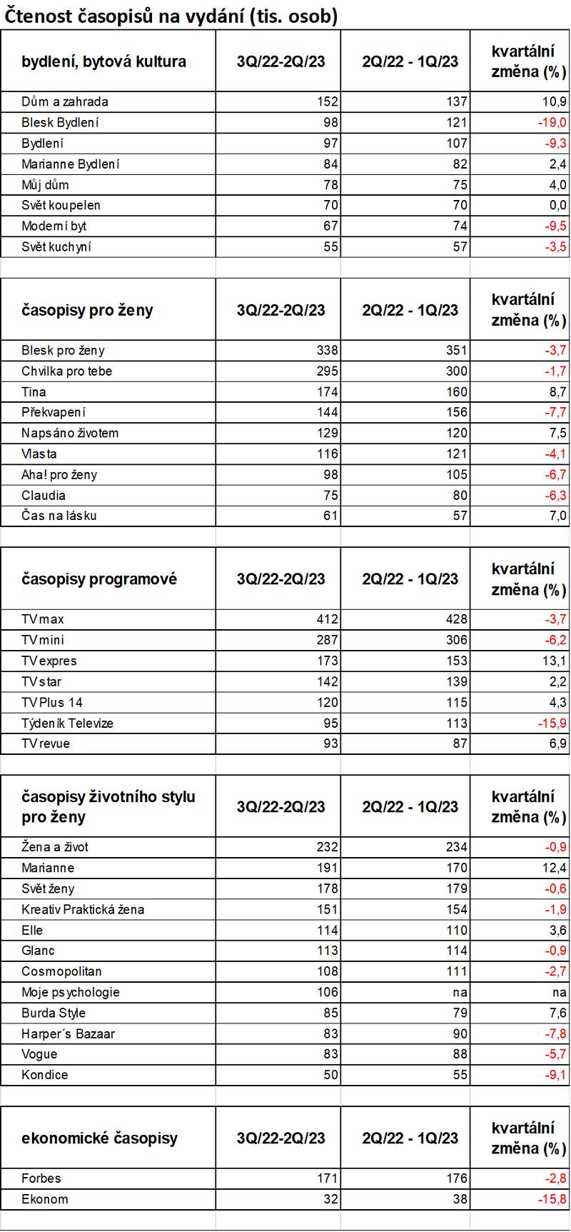 Souhrnná čtenost tuzemských časopisů představovala v uplynulých dvanácti měsících končících 30. červnem 6,55 mil. osob ve věku 12-79 let. To je srovnatelný výsledek jako v předešlém měřeném období (-0,8 %).
