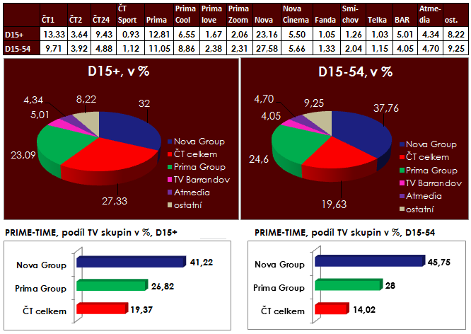 Nejsledovanějším večerním pořadem byl ale klasický film Vesničko má středisková (TV Nova), který zhlédlo více než milion diváků starších 15 let při podílu 29 %, resp. 35 % v 15-54. I díky tomu dosáhla skupina Nova v prime-time 41 % (15+) a 46 % (15-54).