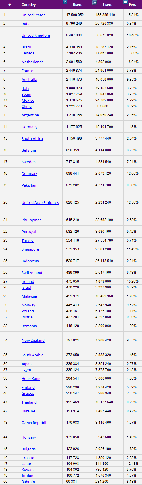 V zemích s nejvyšším počtem uživatelů na LinkedIn (USA, Indie) není poměr uživatelů mezi LinekdIn a Facebookem tak výrazný: například v USA je počet uživatelů na LinekdIn zhruba třetinový ve srovnání s počtem uživatelů na Facebooku.