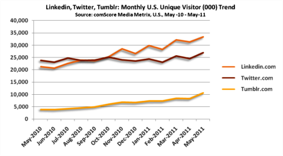 Profesní síť LinkedIn dosáhla v červnu na americkém trhu podle dat ComScore 33,9 mil. unikátních návštěvníků, zatímco My Space klesl na 33,5 milionu. Růstový trend vedle LinkedIn provází i Twitter, který už překročil hranici 30 milionů. A roste i blogerská sociální síť Tumblr.com. Samozřejmě, že na čele tohoto průvodu je Facebook s téměř 161 mil. uživateli v USA a se 750 miliony uživateli celosvětově. Facebooku se navíc daří zvyšovat průměrnou dobu, kterou na něm uživatelé stráví, což je v jeho případě relativně důležité.