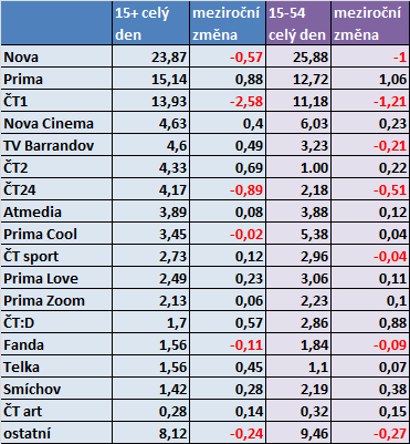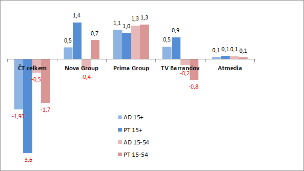 Pozn.: AD = celý den, PT = prime-time, změna v procentních bodech