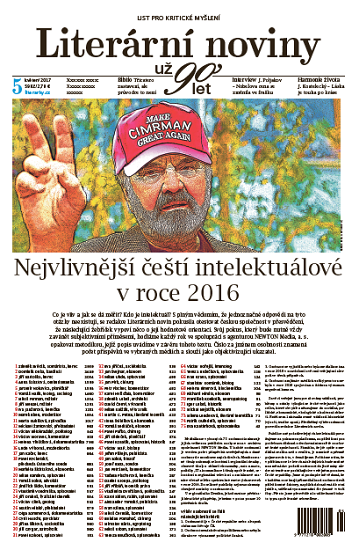 Květnové vydání měsíčníku Literární noviny, které je v prodeji od čtvrtka 27. dubna, vychází v zatím nejvyšším rozsahu 72 stran. Navýšení rozsahu je dáno přílohami, které souvisejí s výstavou Svět knihy – Maďarská literatura a Rakouská literatura. Jako zvláštní příloha také vychází příloha věnovaná právě Světu knihy. Na titulní straně také vychází žebříček nejvlivnějších českých intelektuálů v roce 2016. První místo obsadil Zdeněk Svěrák. Žebříček vznikl ve spolupráci se společností Newton Media. Objevují se v něm i někteří novináři (Václav Moravec, Jindřich Šídlo nebo Miloš Čermák). Podle vydavatele chtějí Literární noviny ve zveřejňování žebříčku pokračovat i v dalších letech.