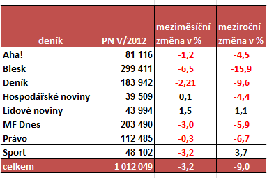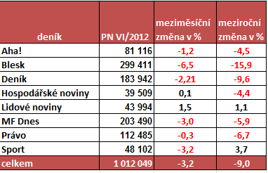Lidovým novinám se navíc podařilo zvýšit prodaný náklad i oproti stejnému období vloni (+1,1 %). Meziroční nárůst prodaného nákladu není mezi českými deníky v posledních letech příliš obvyklý. Letos v červnu meziročně zvýšil prodaný náklad i sportovní Sport, a to především díky fotbalovému mistrovství Euro 2012. Díky květnovému hokejovému šampionátu byly už květnové prodeje deníku Sport vyšší, proto ve srovnání s červnem je patrný mírný meziměsíční pokles.
