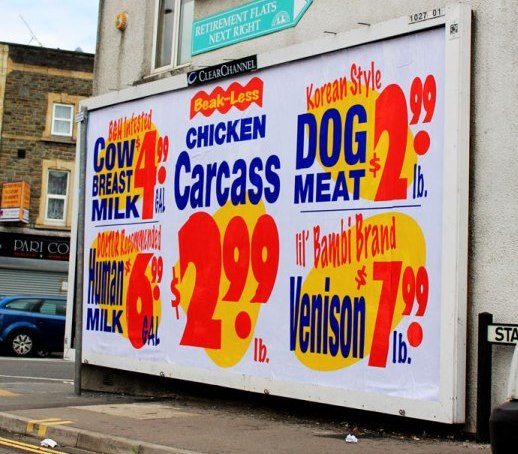 Američan Ron English na svém billboardu umístěném naproti supermarketu Lidl v Bristolu láká na mateřské mléko, psí maso či kuřecí zdechliny za akční ceny.