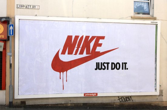 Mezi billboardy, které se objevily ve městech Leeds, Manchester, Birmingham, Bristol a Londýn, vyniká parodie na kampaň Nike s fotbalistou Waynem Rooneym z roku 2006. Její autor Bill Posters si vypůjčil původní vizuál Wayna Rooneyho s červeným křížem na prsou, kterému do rukou dal tašky s logem značky Foot Lockers a obchodu se sportovním oblečení JD Sports. Původní slogan „Just Do It“ pak vyměnil za slogan „Just Loot It“ („Prostě to zplundruj“).