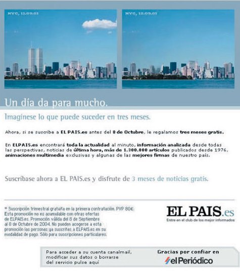 V roce 2004 si naběhl španělský deník El País, který využil k propagaci tříměsíčního předplatného online zpravodajství zdarma motiv 11. září se sloganem: „Za jeden den se toho může stát hodně. Představte si, co se může stát za tři měsíce.“ Po vlně kritiky z celého světa se deník omluvil ve svém editorialu s tím, že žádné vysvětlení není dostatečné pro omluvu všech chyb, kterých se dopustil svou kampaní.