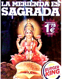 Na globální úrovni se musel omluvit také řetězec rychlého občerstvení Burger King, když se ve Španělsku objevila lokální reklama spojující hinduistickou bohyni bohatství Lakšmí s hamburgerem z hovězího masa, které je pro věřící hinduisty zakázáno. Spojení vegetariánské Lakšmí s masovou pochoutkou hinduisty urazil, a slogan „La merienda es sagrada“ (Snack je svatý) už byl jen poslední kapkou jejich trpělivosti.