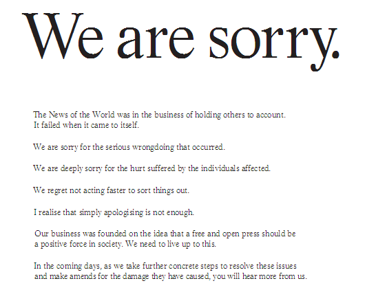 Skandál s odposlechy, který vedl k okamžitému zatavení britského populárního bulvárního titulu News of the World, se rozrůstá do krajních rozměrů. Na konci minulého týdne přiměl mediálního magnáta Ruperta Murdocha, kterému News of the World patřil, k omluvným inzerátům, které byly vytištěny napříč všemi tituly Murdochova impéria. Stěžejní část vizuálu, na závěr podepsaná Rupertem Murdochem, vypadala takto: