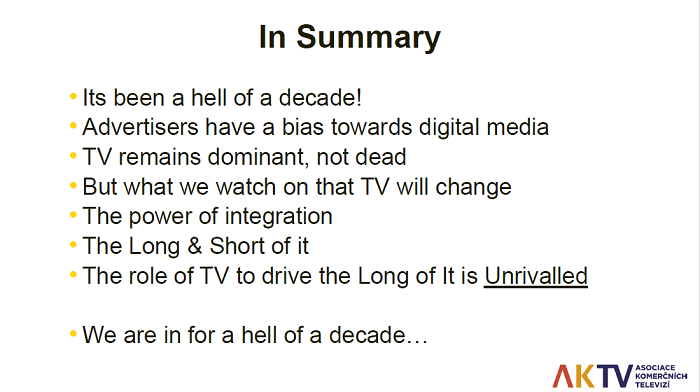 Televizní investice ale Ritson vidí jako cíl, po kterém digitální hráči (představovaní hlavně duopolem Google/Facebook, u nichž Group M odhaduje 85% podíl veškerých digitálních investic) půjdou. „Je jen jedno místo, kde online může brát pro svůj další růst, a to je televize. Je to bitva mezi digitálem a televizí,“ popsal. Technologické firmy se budou snažit útočit nejen na reklamní televizní rozpočty, ale „boj desetiletí“ se podle Ritsona svede i o samotnou televizní obrazovku. Přesněji o „připojenou televizní obrazovku“. Tu totiž vidí jako klíčové médium. „Neříkám, že televizní firmy vyhrají, ale to je hřiště, kde se bude hrát a o které se bojuje. Digitální firmy se do ní budou chtít nepochybně dostat,“ prognózuje. Na mysli ale nemá podobu televizního vysílání z období před deseti lety. Aby stávající televizní společnosti v této soutěži obstály, musí se změnit – musí se digitalizovat. A s ohledem na velikost českého trhu Ritson v následné diskusi zmínil, že velmi pravděpodobně bude možné nadnárodním internetovým gigantům čelit pouze díky kooperaci s mezinárodními televizními hráči nebo asociacemi.