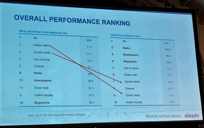 Doba, ve které žijeme, označována také jako post-faktická, má mít také svůj díl viny na tom, že se fakta o efektivitě mediálních kanálů přehlížejí. Svůj vliv má i vnímání vývoje mediální konzumace samotnými lidmi z marketingu nebo agenturami, které mají tendenci projektovat vlastní způsoby konzumace médií na všechny spotřebitele. Výsledkem je, že zatímco data ze studie Re-evaluating Media od Ebiquity dokládají, že tradiční kanály (TV, rádio, noviny, časopisy) mají nejsilnější vliv na budování značky (v atributech například jako zásah, cílení, ROI atd.), komunita marketérů a agentur nadhodnocuje efekt sociálních médií a online videa. „Je to střet mezi vnímáním a realitou,“ poznamenal Ritson.