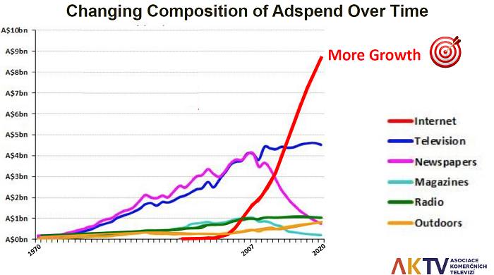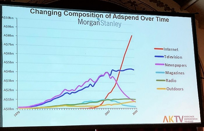 Mark Ritson nejprve shrnul vývoj reklamních investic do mediatypů v posledních 50 letech, a to s pomocí dat od společnosti Morgan Stanley. Jak doložil, poslední dekáda je výrazně ovlivněna růstem digitálních médií, přičemž mezníkem je zde rok 2000, kdy Google začal prodávat reklamu ve vyhledávání, a rok 2007, kdy se na Facebooku objevila reklama. Růst digitálních médií odnesla podle Ritsona hlavně printová média, naopak rádio a outdoor nebyly z pohledu investic nástupem Googlu a Facebooku a dalších internetových platforem tolik ovlivněny. Přičítá to tomu, že rádio i outdoor jsou už dnes více digitální média. Outdoorové nosiče jsou digitalizované a rádiové vysílání v Británii se z více než poloviny uskutečňuje přes digitální platformy – DAB, aplikace, internet. (O českém rádiu ale tato teze neplatí, zde zatím vládne FM poslech, pozn. red.) Na rozdíl od zmíněných mediatypů se televize zatím růst digitálních médií nedotkl a reklamní investice se dosud televizi dařilo zvyšovat. A to i přesto, že v obecném vnímání mají být dny televize sečteny. „Nikdy v historii médií se neobjevilo tolik nesmyslů, které byly tak diametrálně vzdáleny pravdě. Televize neumírá, ale ten mýtus se úspěšně šíří světem,“ poznamenal Ritson. Fakt, že technologické firmy využívají pro svou komunikaci reklamu v televizi a že investice do televizní reklamy zvyšují, má potvrzovat efektivitu televizního média.