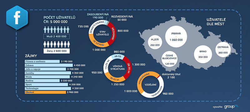 Ze zájmů mezi uživateli vede zábava (zajímá se o ni na Facebooku 4,45 mil. uživatelů), koníčky a technologie (oba 4,35mil.), z měst je nejvíce uživatelů z Prahy (1,060 mil.) a Ostravy (360 tiscí).
