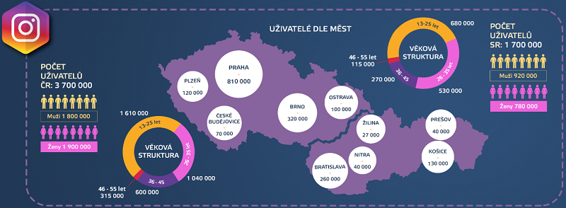 Z hlediska rozdělení na muže a ženy je toto zastoupení na Instagramu více méně rovnoměrné (51 % ve prospěch žen) a nejvíce českých uživatelů je z Prahy (810 000), Brna (320 000) a Plzně (120 000).
