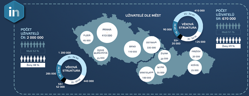 - Na LinkedInu dnes najdete až 2 000 000 českých uživatelů s tím, že uživatelé LinkedInu jsou ze všech „českých“ sociálních sítích průměrně nejstarší