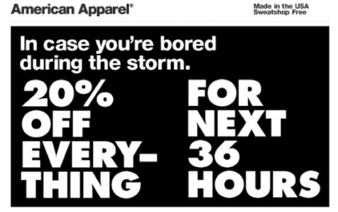 Americké značky nezastavil ani hurikán Sandy, který na začátku listopadu paralyzoval východní pobřeží Severní Ameriky. Oděvní společnost American Apparel jej využila ke speciální „hurikánské“ promoční akci, v níž inzerovala 20% slevy na nadcházejících 36 hodin.