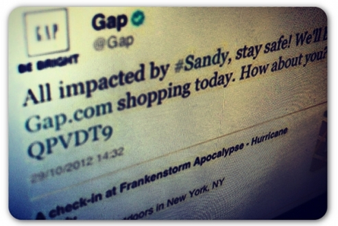 Podobný krok učinila oděvní značka Gap, když na Twitteru nabádala uživatele k on-line nakupování. Výsledkem byla vlna nevole a rozhořčení nad neetičností a nevkusností těchto kampaní.