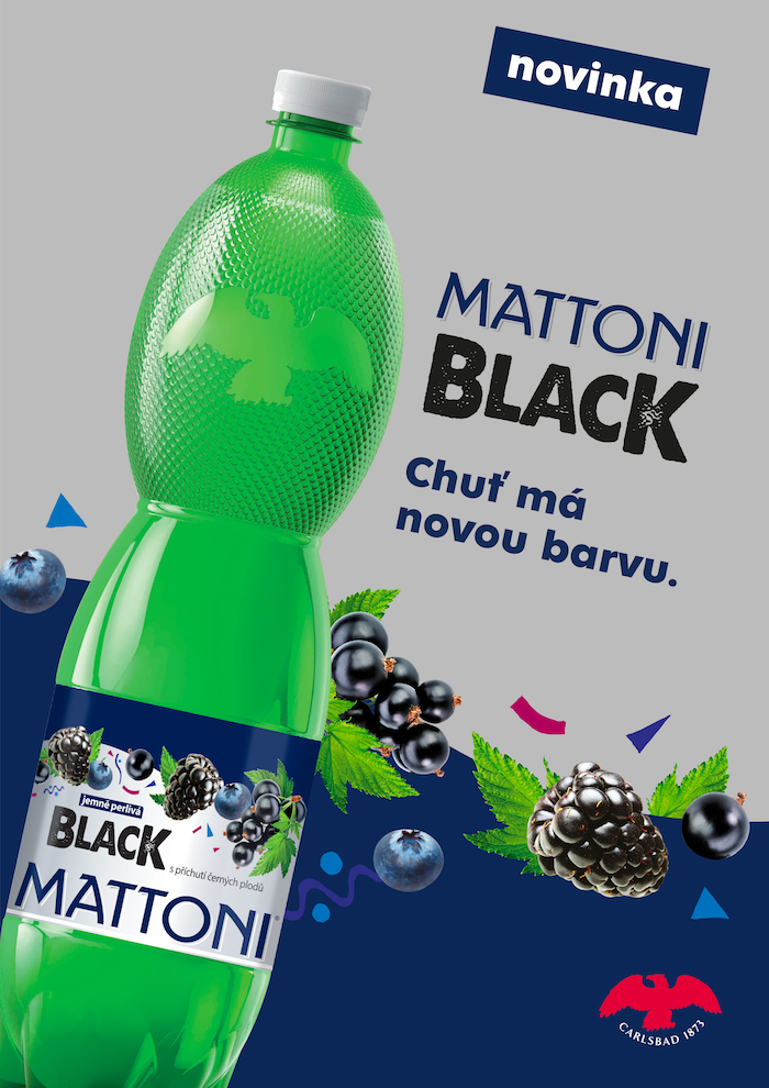 Značka Mattoni uvádí na trh novinku pod názvem Mattoni Black, jímž odkazuje na příchuť černých plodů ostružin, borůvek a černého rybízu. K dostání je od začátku května ve všech obchodech moderního i tradičního trhu, a to v PET lahvích o objemu 0,5 l a 1,5 l.