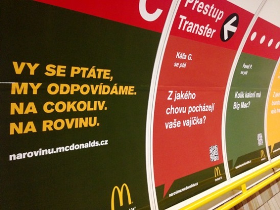 McDonald’s od začátku ledna podporuje venkovní inzercí svůj web Na rovinu, na kterém nepřetržitě odpovídá na dotazy z řad veřejnosti. Od svého spuštění v loňském roce v dubnu bylo zodpovězeno již na čtyři tisíce otázek.