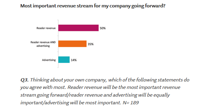 Stále více staví vydavatelé svůj byznys model převážně na čtenářských předplatných a placeném obsahu, což je případ 50 % dotázaných. Třetina (35 %) chce kombinovat předplatné s příjmy z reklamy a jen 14 % spoléhá pouze na reklamu.