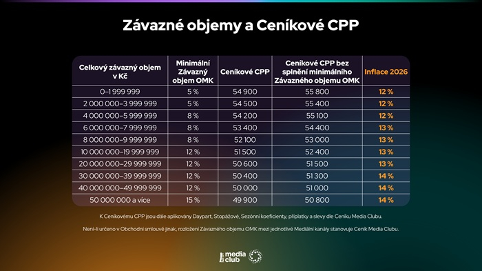 Mediální zastupitelství Media Club představilo v minulém týdnu rysy své obchodní politiky pro rok 2026. Průměrné navýšení cen reklamy v jednotlivých mediatypech obchodovaných společností Media Club ve srovnání s rokem 2025 je následující:
