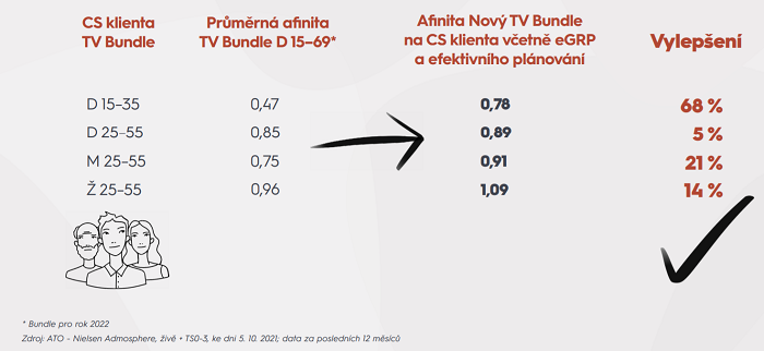 Od klientů a agentur jsme si vyžádali informaci, na jaké cílové skupiny klienti cílí, a to po jednotlivých produktech. Na základě toho jsme provedli optimalizaci bundlů, abychom rozdělili naše GRPy co nejefektivněji. Proto jim teď můžeme nabídnout bundly, které jsou optimalizovány jak pro klienty, tak pro naše inventory. Celkově by tak mělo docházet k vylepšení afinity klientů.