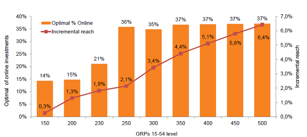 Tato úvaha vychází z matematické optimalizace společného zásahu televize a online: z níže uvedeného grafu vyplývá, že online video přináší televiznímu zásahu víc, pokud ve společném prodeji s TV reklamou představuje jeho podíl více než třetinu celkových investic. Společný prodej televizní a online reklamy má tak zadavatele motivovat k primárnímu navyšování investic do těchto mediatypů, a to přesunutím investic z netelevizních médií.