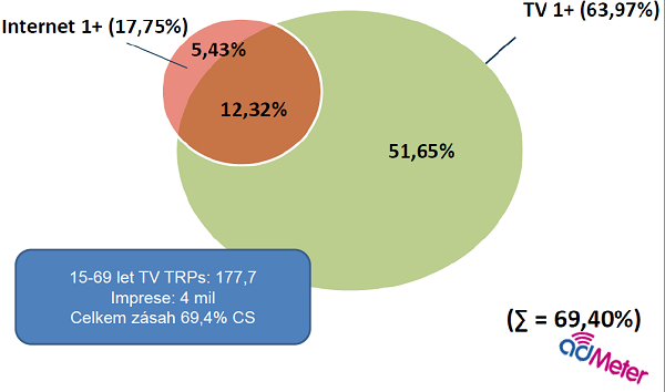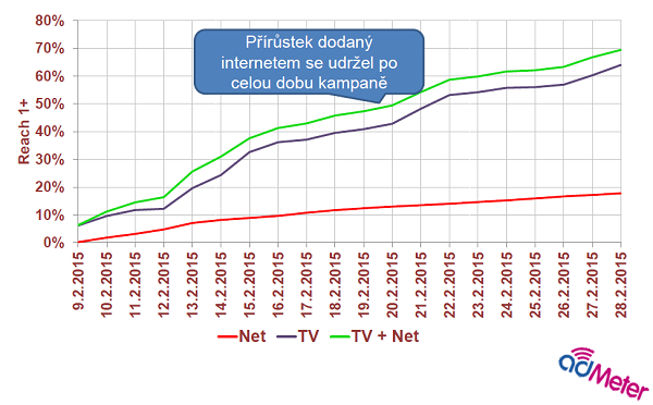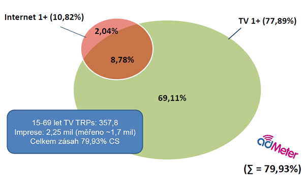 Media Club porovnával přínos video online reklamy ve společném prodeji s televizní reklamou na základě dvou kampaní, které se právě lišily sílou zastoupení televize a onlinu. Měření se uskutečnilo pomocí technologie adMeter (adMeter panel pracuje s 300 respondenty). Menší kampaň o velikosti 358 televizních TRPs a 2,25 mil. impresí vytvořila celkový zásah 80 % cílové skupiny 15-69 let. Překryv televizního a onlinu zásahu činil 9 %, zásah jen online byl na úrovni 2 % – přínos online pro zásah v cílové skupině byl tak na úrovni 11 %.